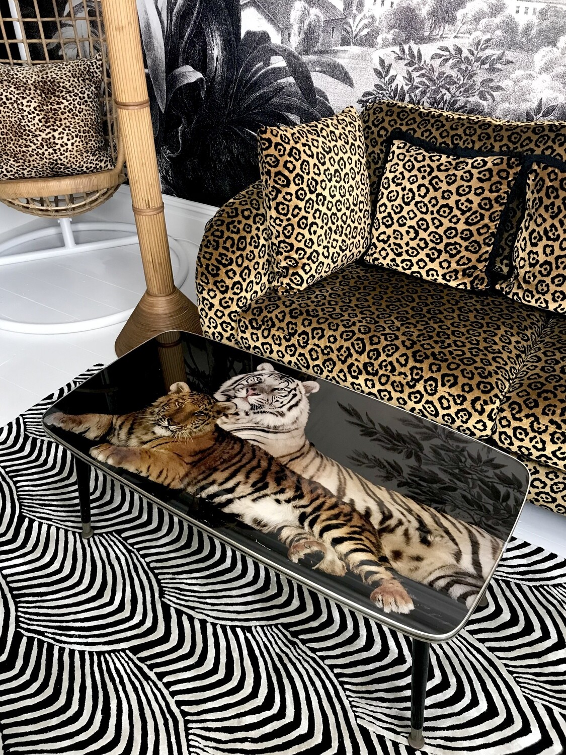 Mid Century 1960’s Bengal tigers dansette legs glass large coffee table 17”x39”. Unseen before super kitsch roaringly good picture under glass top, large statement wild decor piece. A pair of reclining Bengal Tigers looking very superior on a black background. Decorative trim to this wooden table with original black dansette legs and brass metal feet. Fantastic condition heavyweight and sturdy. The image has a slight rippling to the paper which runs fully across the design, giving a textured effect, only seen at a certain angle. The glass surface is in an amazing condition with its chrome and black detail edging fully intact. It really is a cool show stopper piece, large enough for four people to eat around or have cocktails. H 43cm W 99cm D 49cm. Collection DE12 or courier options