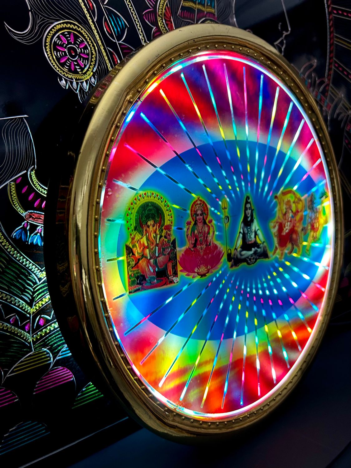 Vintage 1970’s kitsch psychedelic spinning halo wall light Hindu Krishna Indian decor made in Taiwan. This super rare circular statement light has an electrical motor which spins an inner multicoloured spiral plastic disc. As this spins rays of coloured light penetrate through the glass design top disc. Housed in a gold plastic rim framed case, the light has been tested and fully working, although you can lightly hear the motor gently running. It can be mounted on a wall or sat on a table top as it has three small feet to the reverse plastic case. This spiritual piece comes with a very long black flex cable as it previous life was a shop display, high on a wall out of reach. You could shorten to suit your requirements. Length of black flex cable 4 metres. Just as beautiful off as on with a diameter of 11.5”